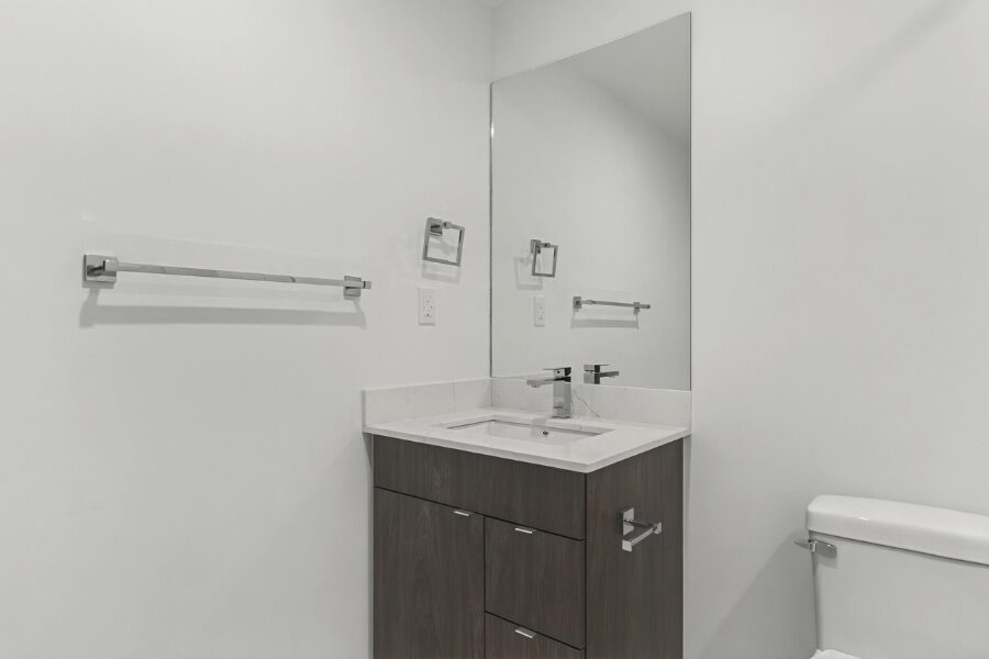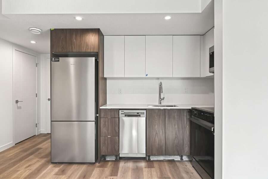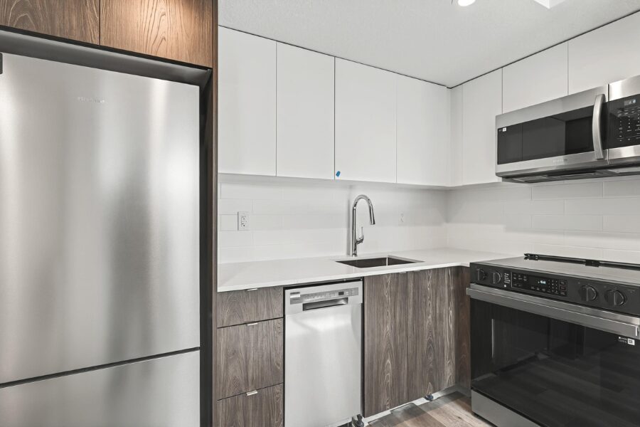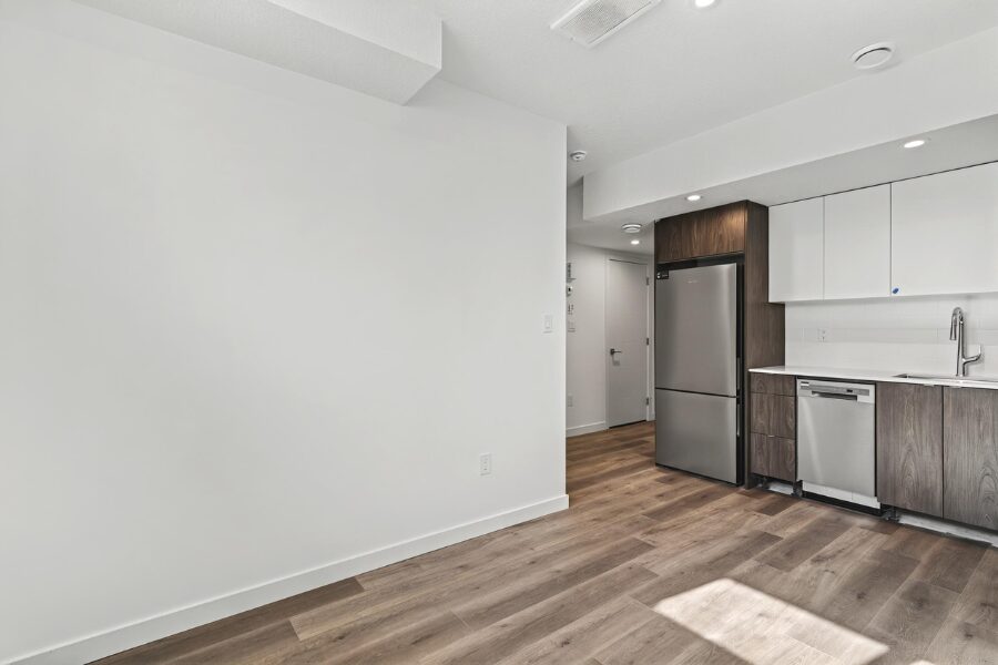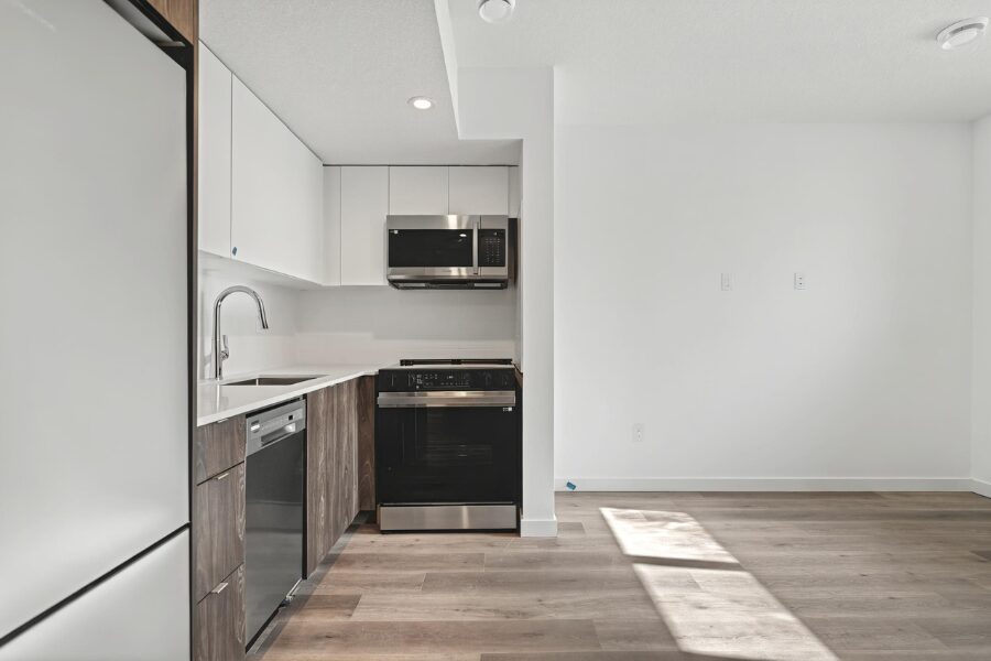 The suite features a modern open-concept layout with large windows, durable vinyl plank flooring, and fresh contemporary finishes throughout. The kitchen comes fully equipped with stainless steel appliances, sleek cabinetry, and quartz countertops, providing both style and functionality.