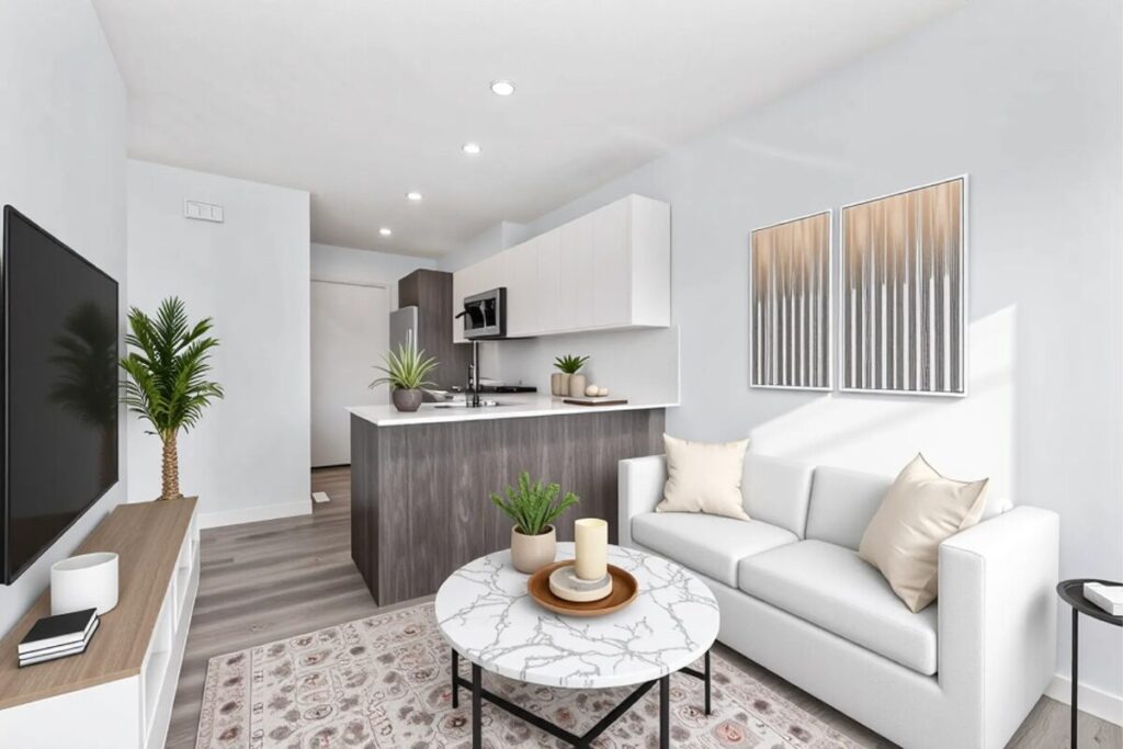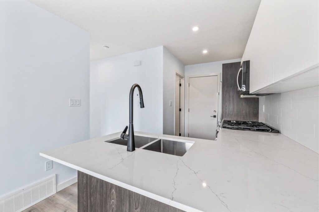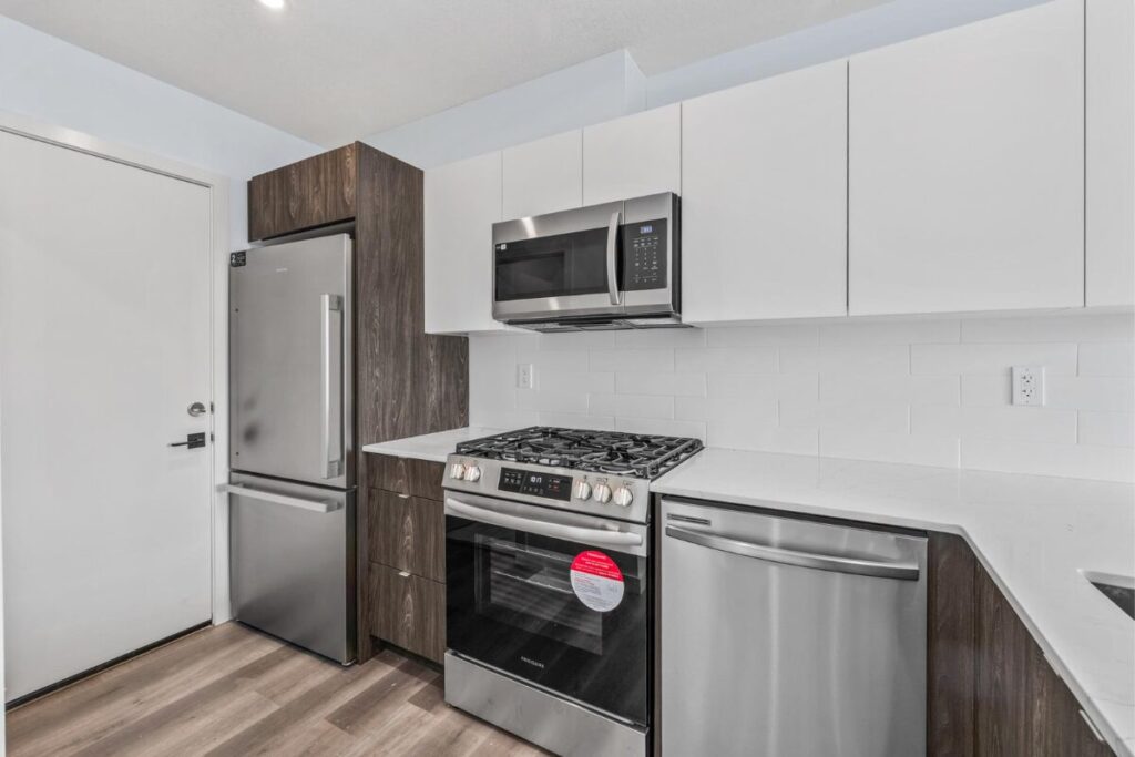 The suite features a contemporary kitchen with quartz countertops, two-tone cabinetry, a tile backsplash, and stainless steel appliances, including a gas range with an over-the-range microwave.