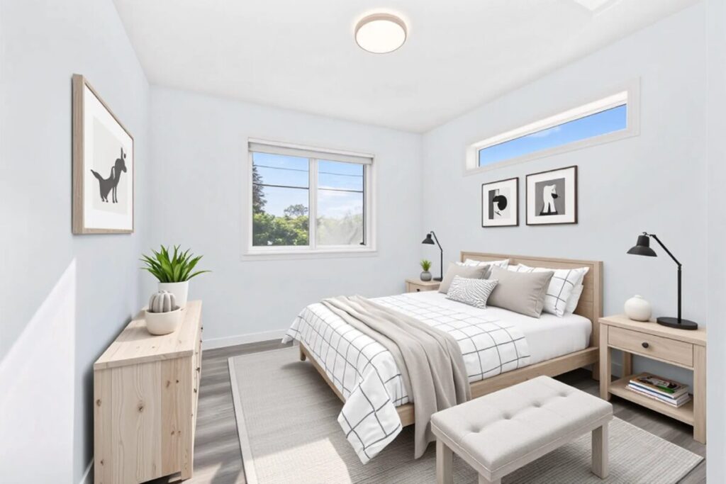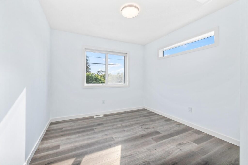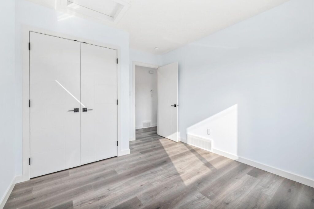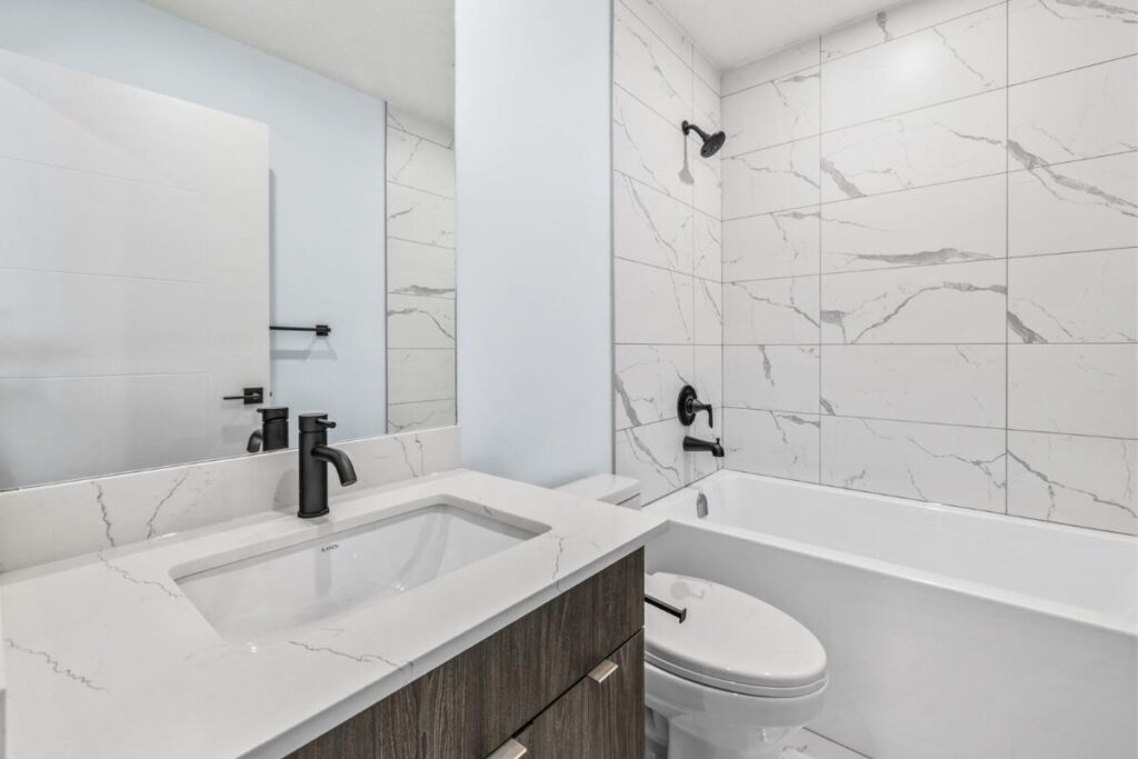 The bedroom offers comfort and storage with double closet doors, and the full four-piece bathroom is fitted with a modern tile surround and matte-black fixtures.