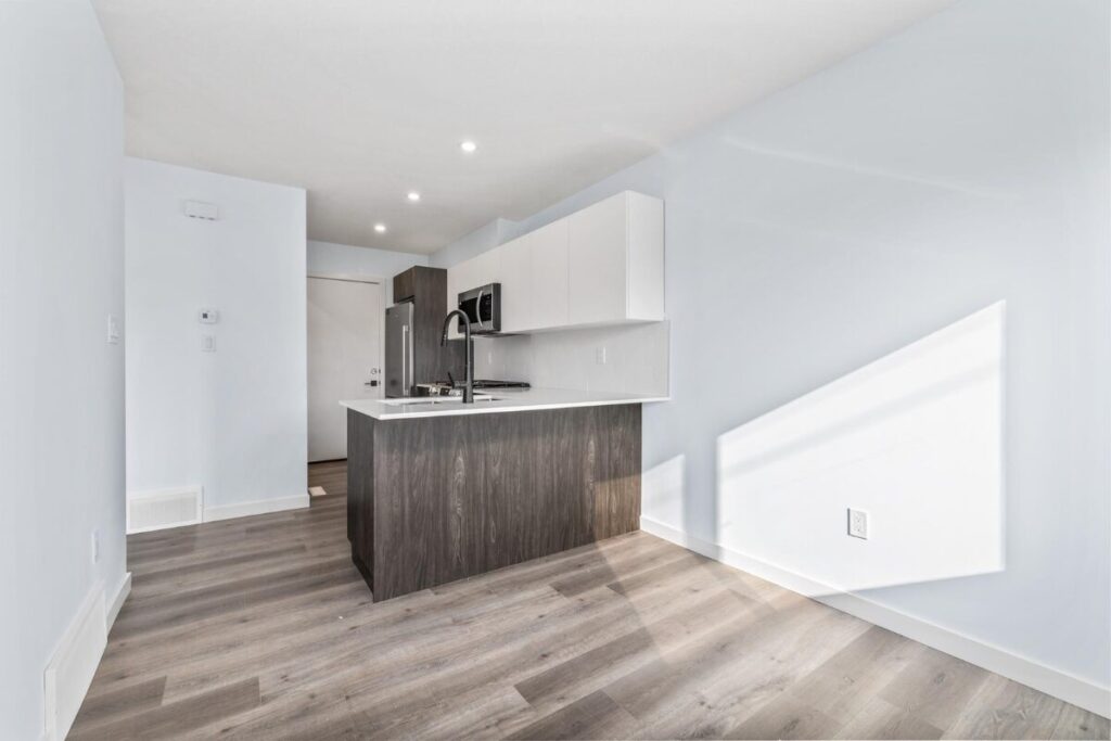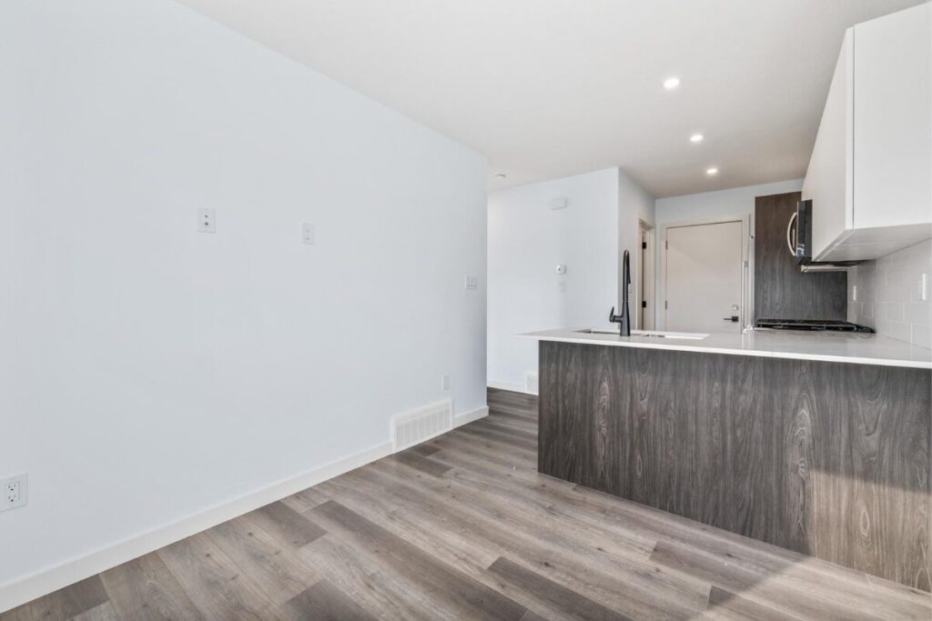 A peninsula provides extra counter space and casual seating, while the open living area is finished with luxury vinyl plank flooring and large windows that fill the space with natural light.